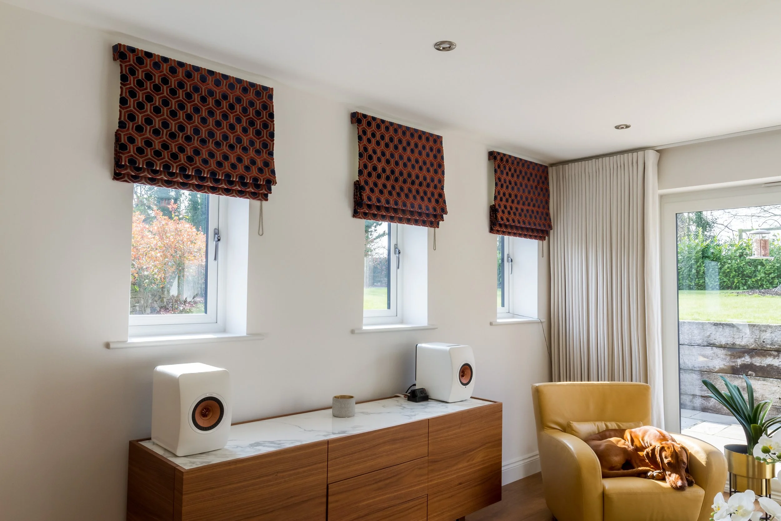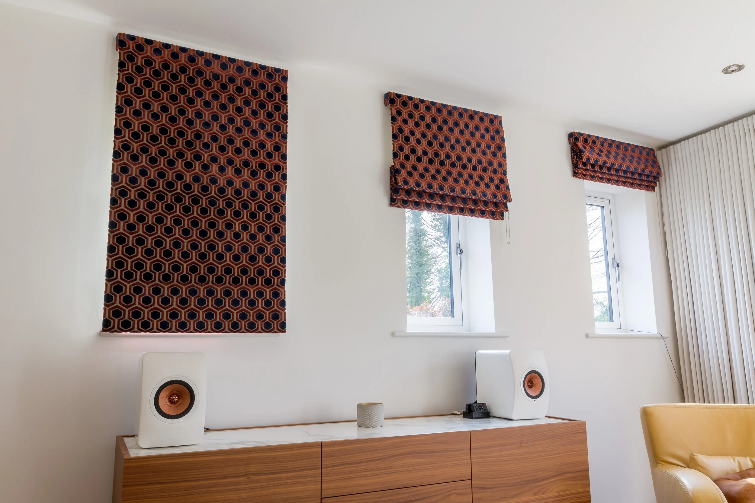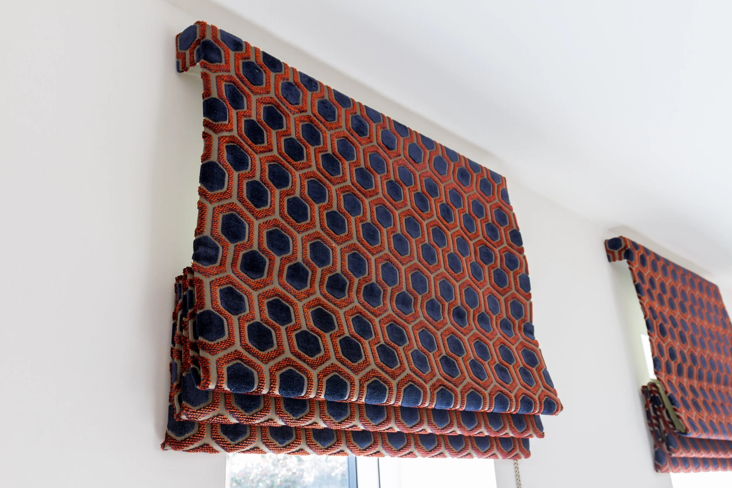 Choose from traditional or waterfall pleats. Perhaps add a trim along the lower edge or a pelmet to go above the blind. Our roman blinds are hand finished and are supplied on a track with a ball chain in a choice of colours (compliant with child safety regulations). Motorised and battery operated tracks are also available.