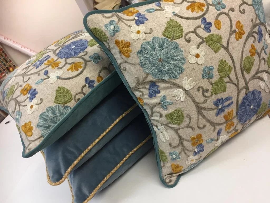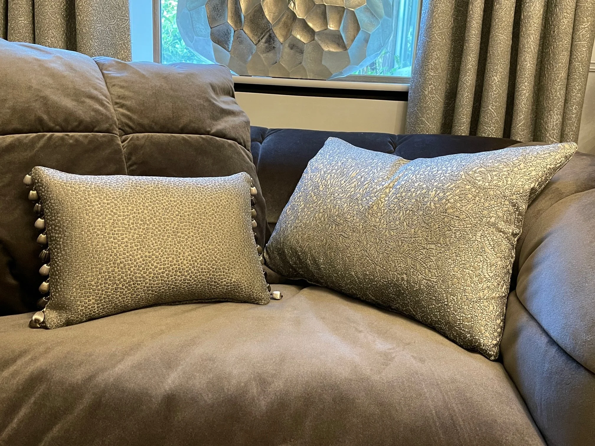 From brands such as Voyage Maison, Harlequin, Villa Nova and Clarke & Clarke. We can also make up cushions in any fabric to any size whilst supplying the inners. Some customers bring in embroideries or tapestries and even old t-shirts or jumpers that have a special meaning and we find a suitable backing and make them up into unique pieces to treasure.