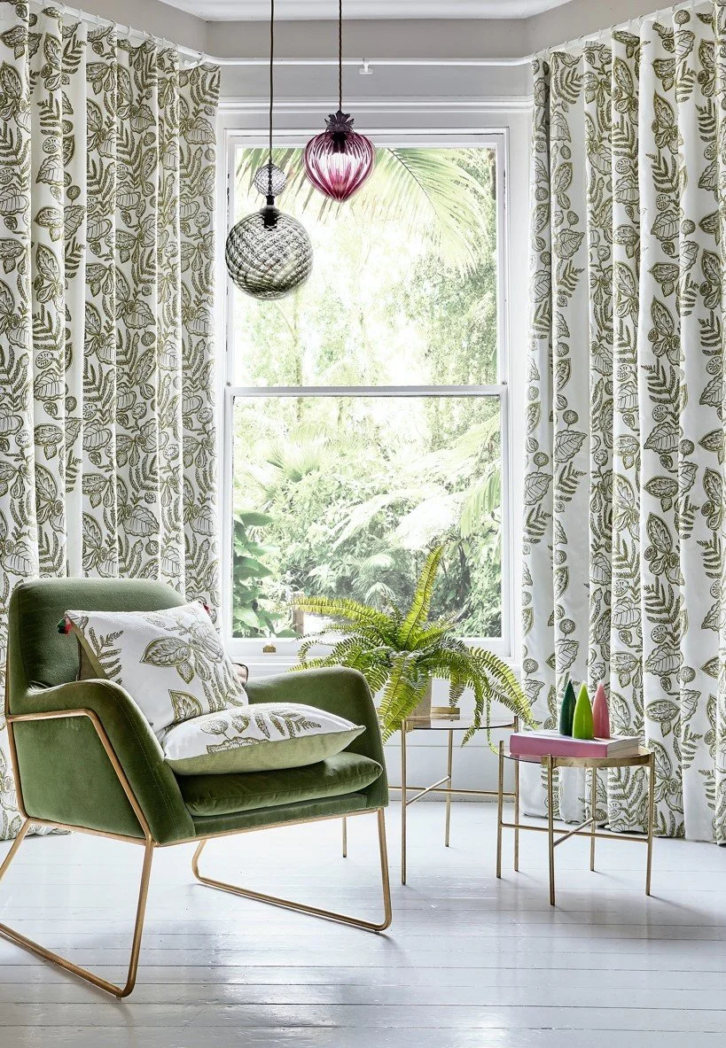 The six fabrics within the Sri Lanka collection all work together well and can be used in varying ways to stimulate the senses and create layering which will appear natural and thought out. If you really want to keep things clean and contemporary with just a splash of floral, then taking the embroidered Summer Fruits Fabric in Lichen as shown below creates a panelling effect that allows enough pale and neutral fabric to come through into the scheme to feel airy and light.