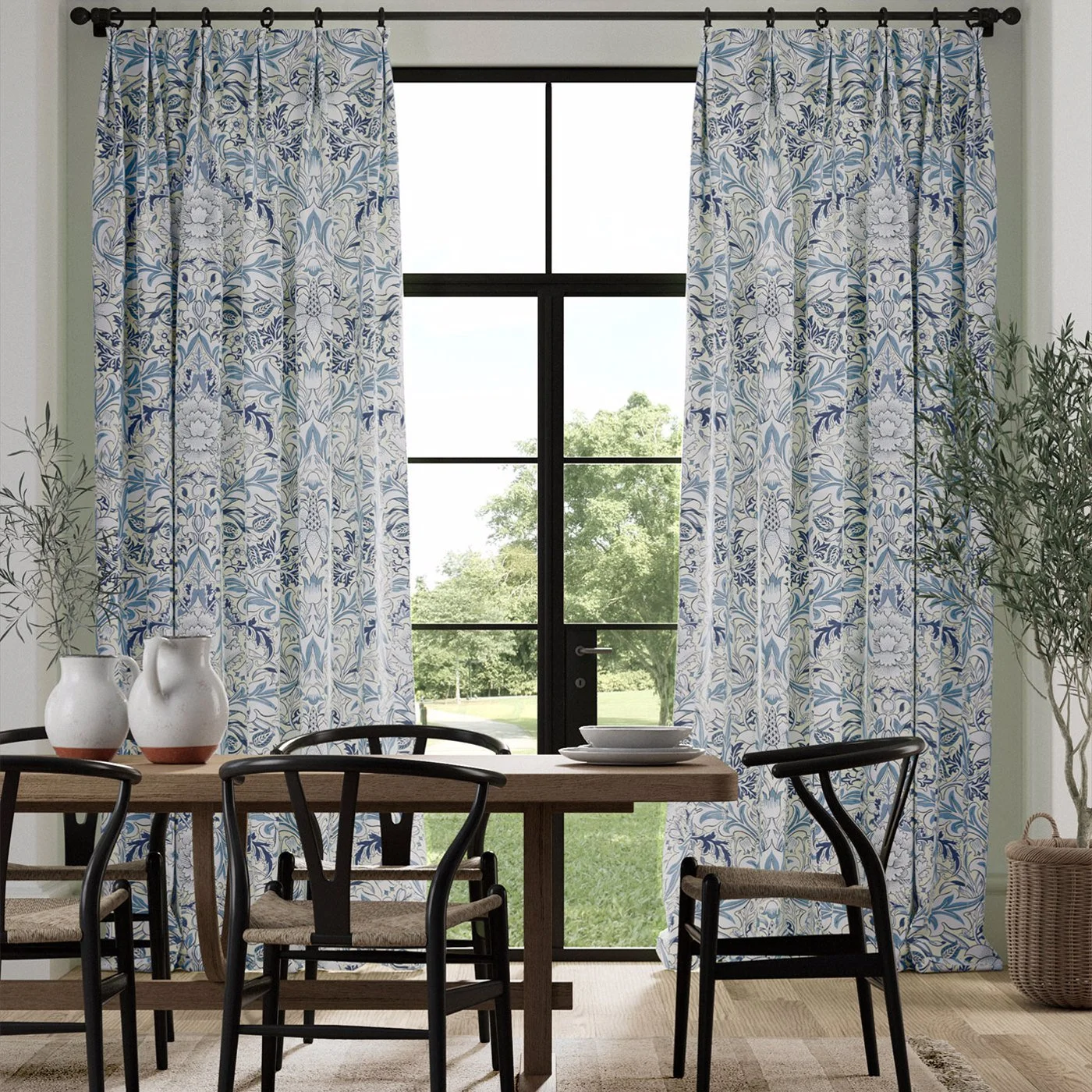 Starting with a fabric like Simply Severn in the Bayleaf and Annatto colourway, it’s the perfect choice for adding a touch of class and sophistication to any window dressing. This dual-purpose fabric produced on a soft cotton/linen blend, was originally designed by J.H. Dearle in 1880 and printed at the Morris Merton Abbey workshop in South London. An elegant damask of acanthus leaves framing a central flowerhead, this is a new design for the Simply Morris collection and as shown above works as a subtle yet engaging choice for curtain fabric.